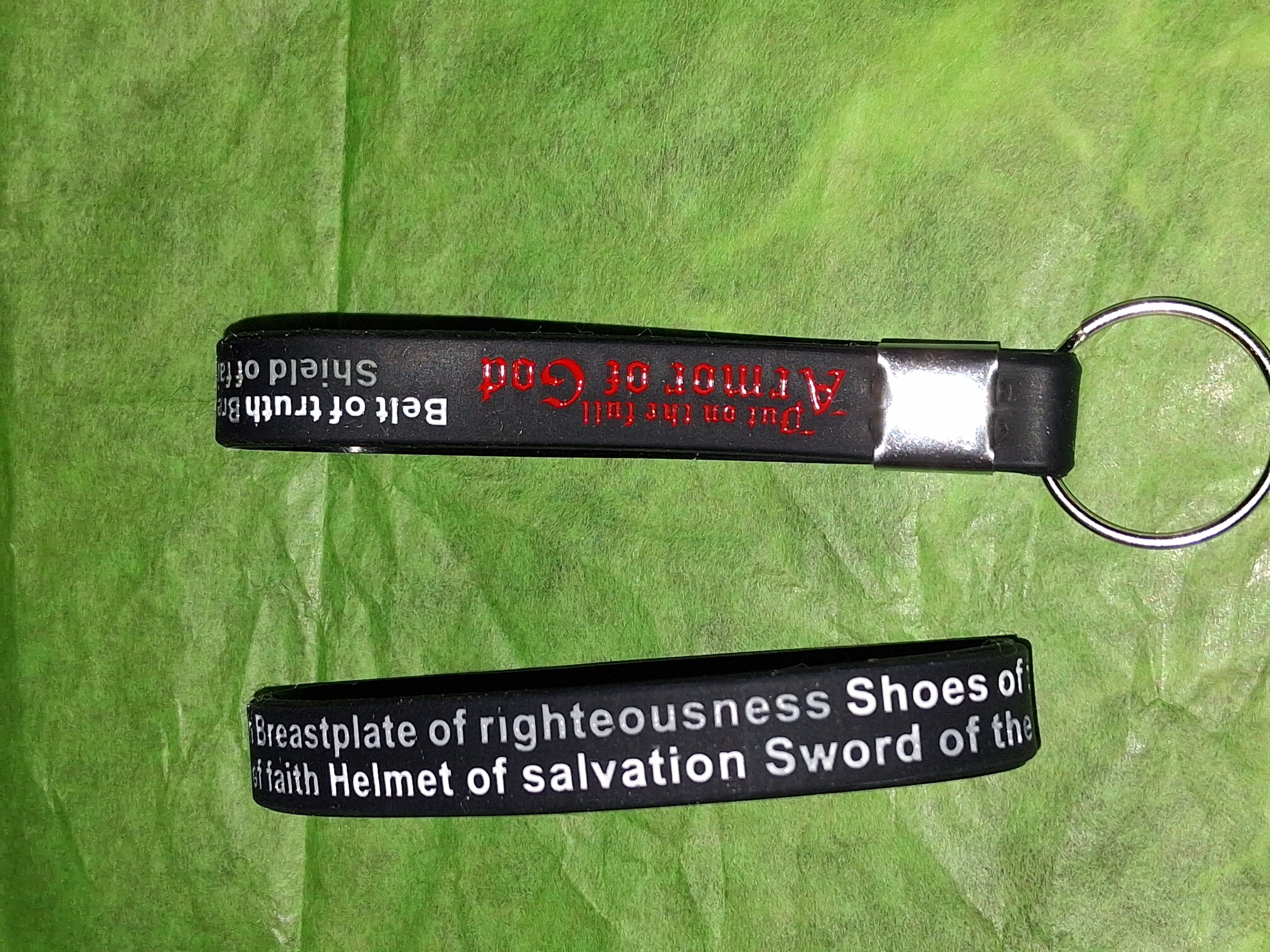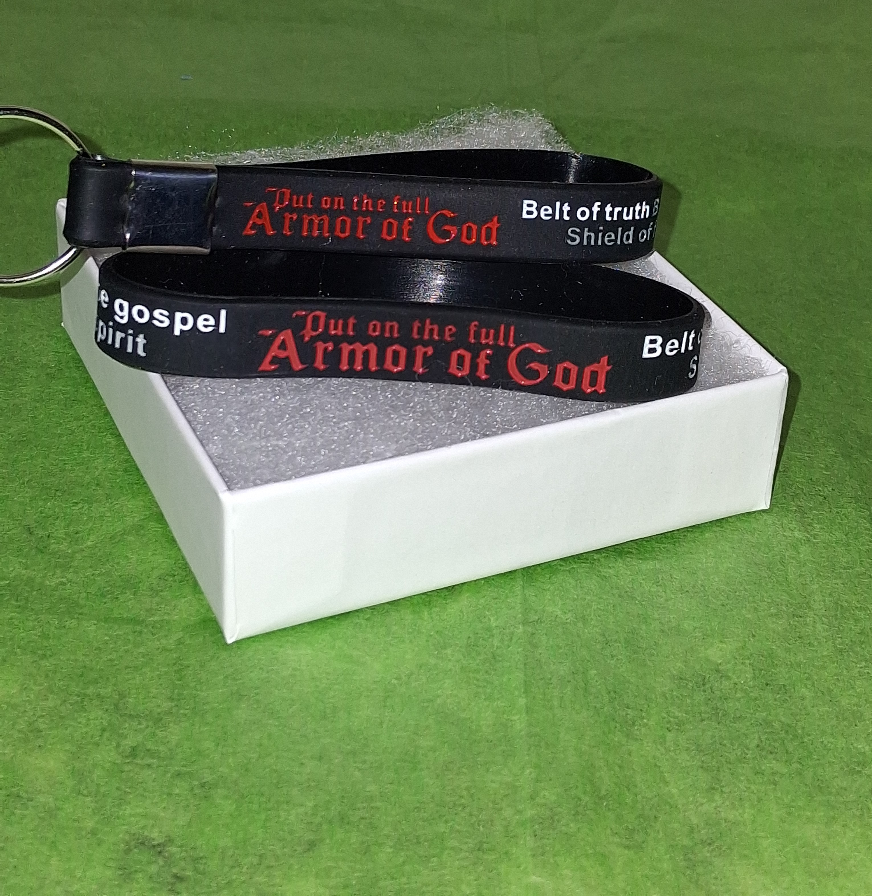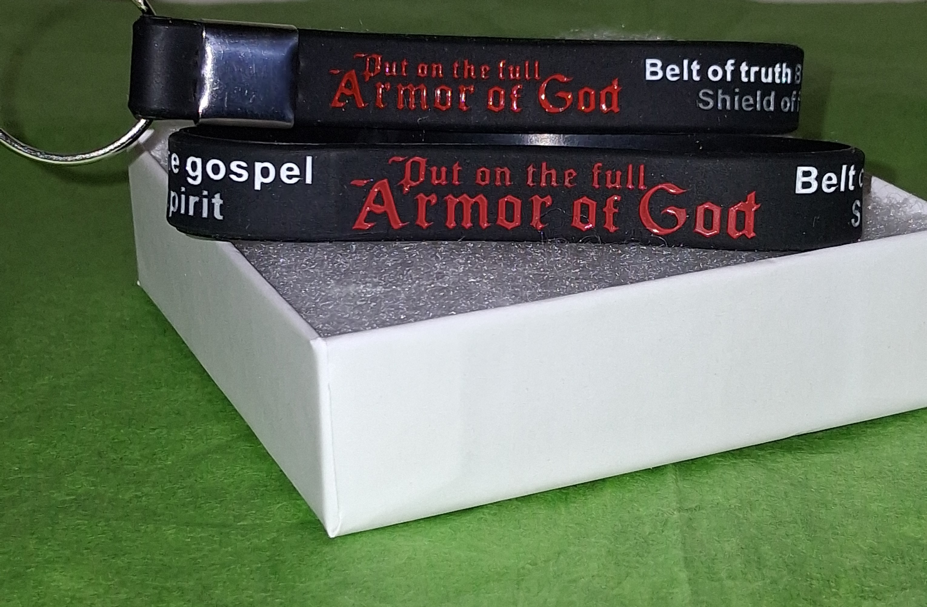 Ephesians 6:13-17 - Armor of God set. It is durable, it is an essential reminder of the importance of always wearing your spiritual regalia for warfare. This set includes a silicone bracelet and key chain with each piece of the spiritual armor engraved thereon. It is for the prayer warrior. Perfect gift new converts to the faith. Awesome reminder for intercessors and most importantly, it is budget-friendly.