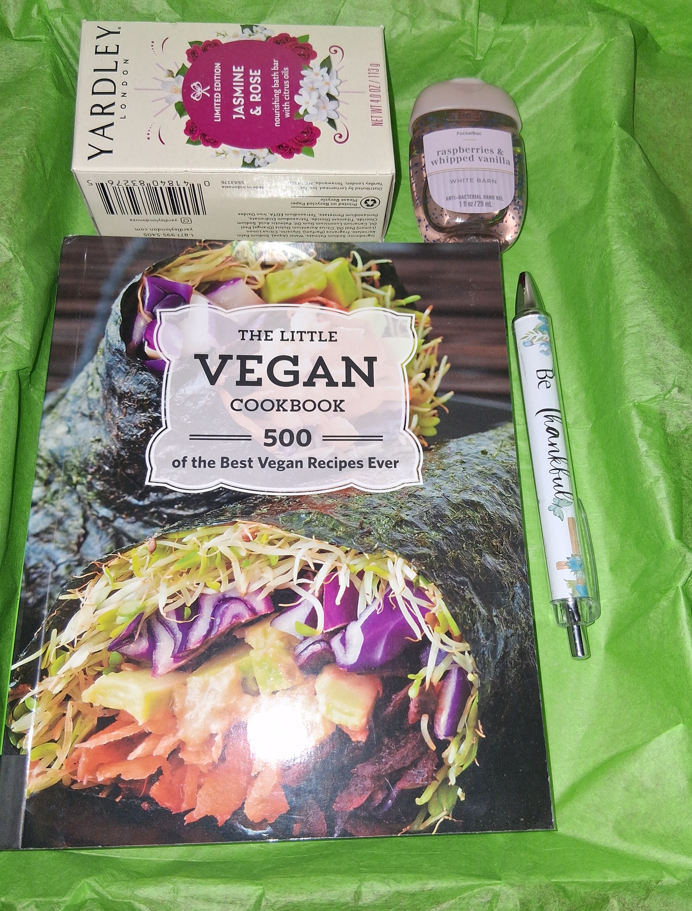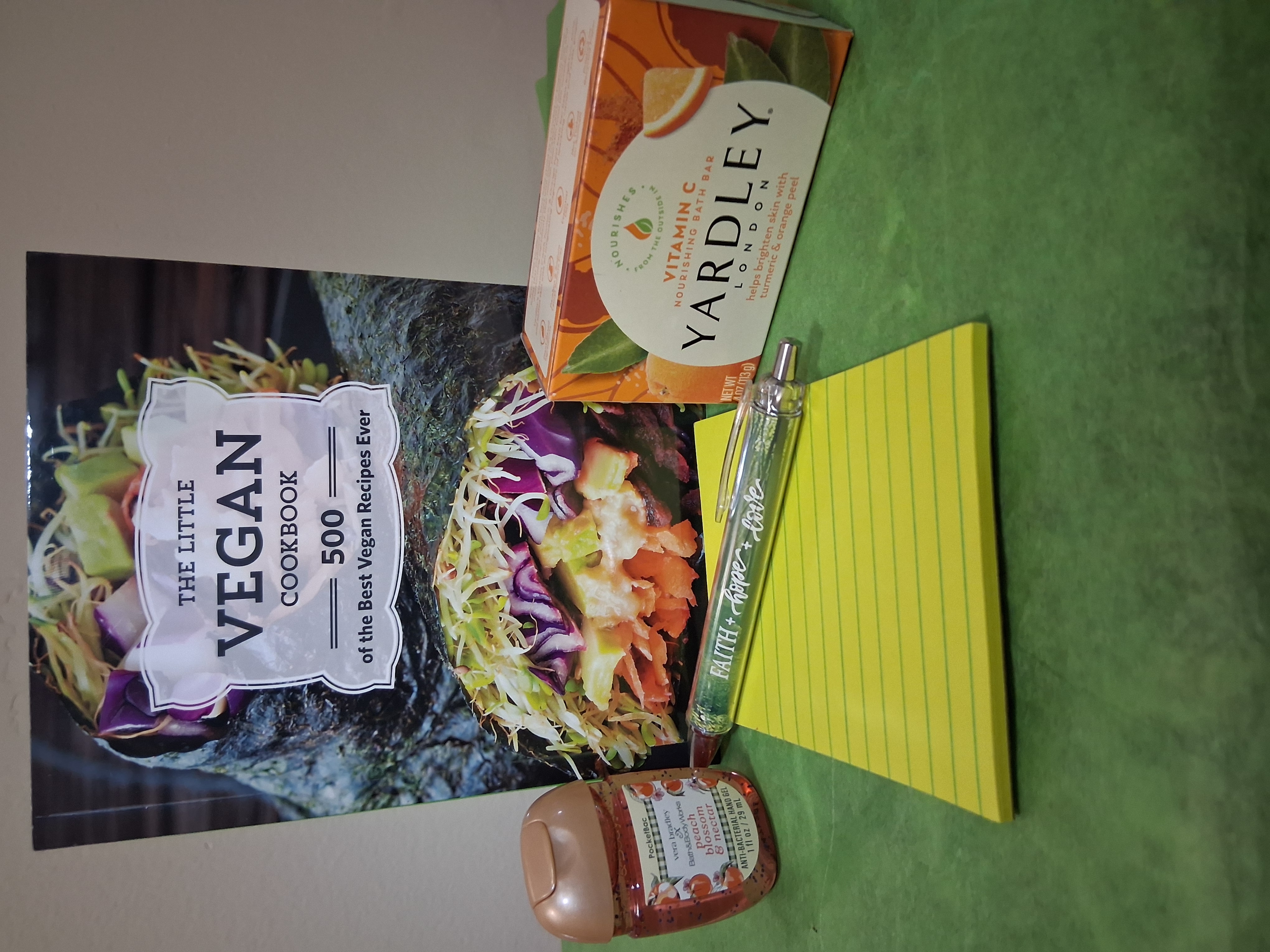 Looking for that perfect gift that is practical and makes that special person feel good. Our Healthier, Happier You Gift set is the ideal gift that states that you care about people, especially those of a vegan diet. Gift set: Vegan cookbook, scripture inspired pen, Bath and Body hand sanitizer, Yardley soap and notepad.