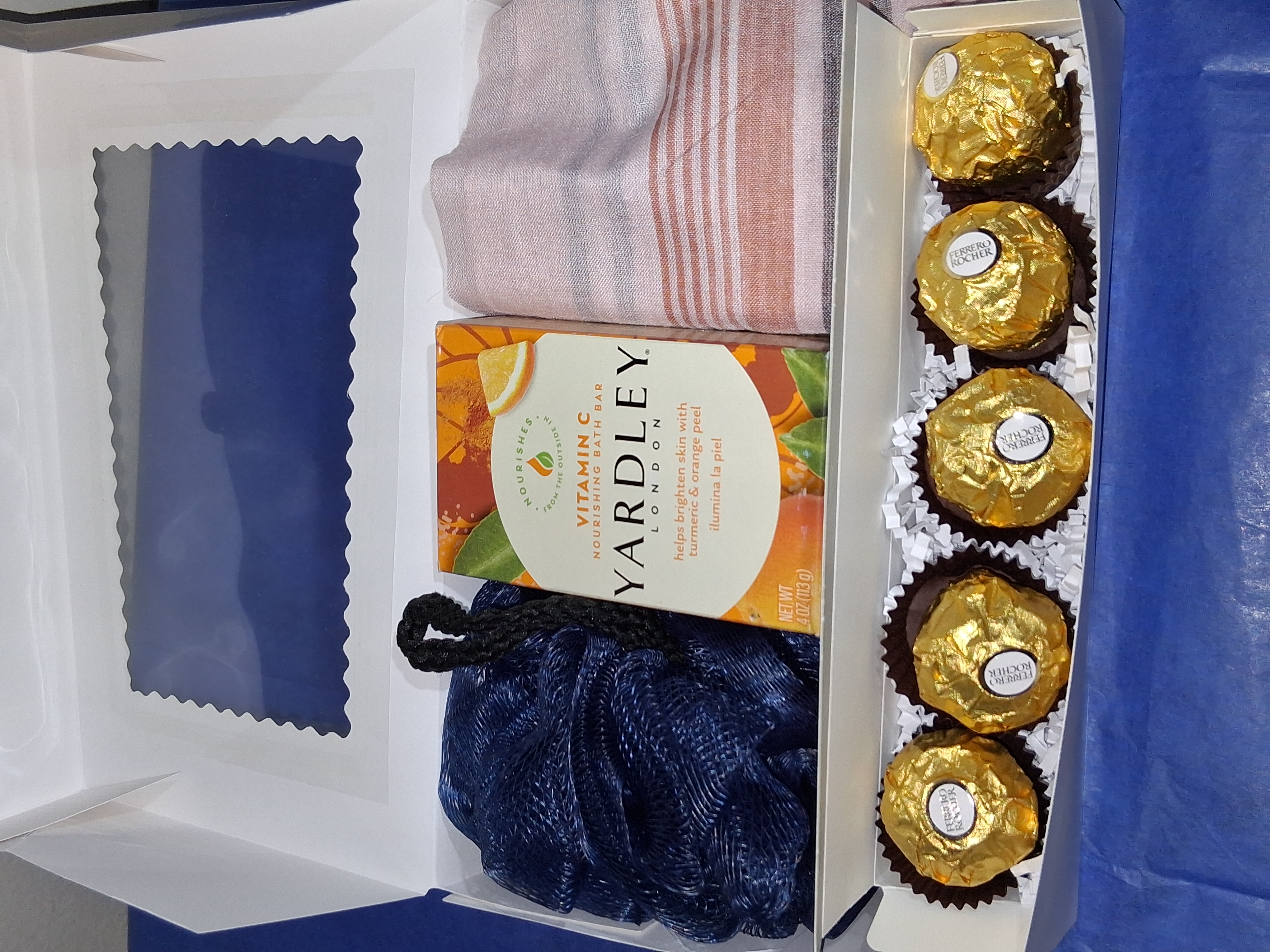 Men's Comfort Gift Set - whether it is for a birthday, Father's Day, anniversary or just because, surprise him with a thoughtfully curated gift set that has a blend of style, care and indulgence. Gift set includes classic handkerchief, bath sponge, moisturizing bath bar and a box of Ferrero Rocher chocolates for a sweet touch.