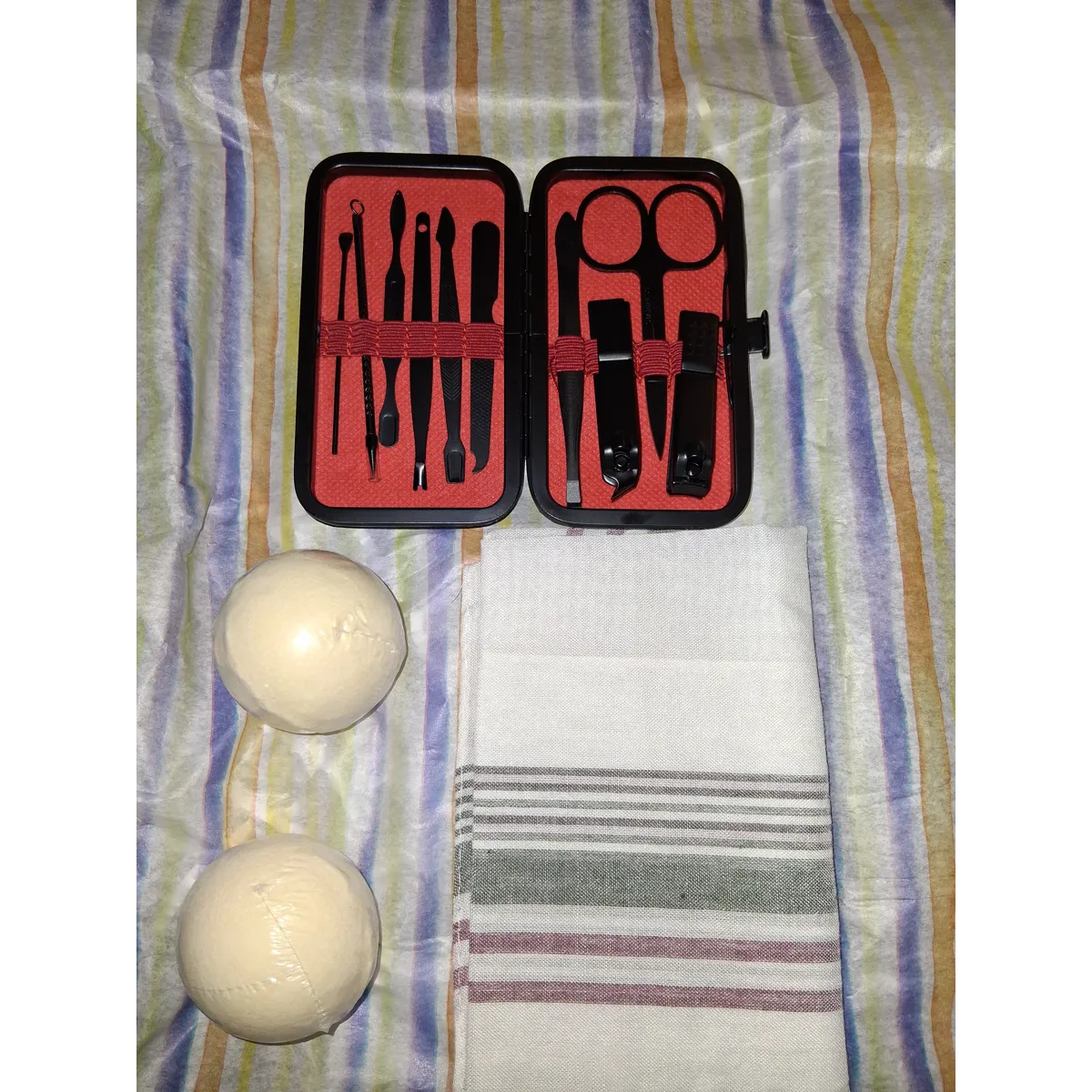 Manicure Kit - 10 black pieces including nail file, scissor, two types of nail clippers, tweezer and other items in a sturdy black protective case.